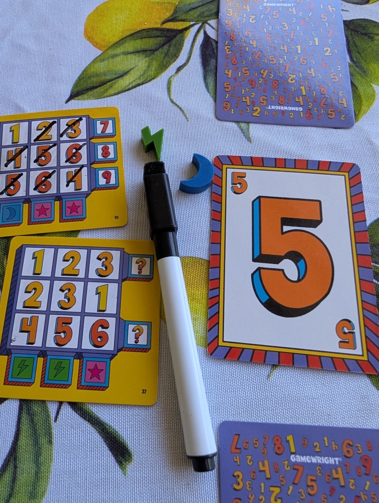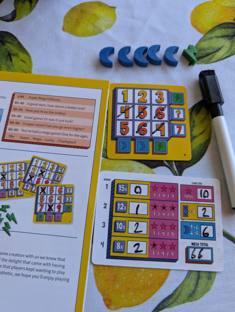 Super Mega Lucky Box is easy to pitch: It’s Bingo/Lotería if it had actual gameplay decisions. You’re given several small 3×3 grids you manage with dry-erase markers, and you mark off numbers 1 through 9 as they are called from a deck of cards. When you complete a row, you’re given a bonus. Maybe the bonus is a type of token, maybe it’s immediately marking off another card. When you fully complete a card, you’ll get big points at the end of round. The end of the round also deals you out another new card to fill. Four rounds of this game and some quick scoring later, and you’re all wrapped up with the game!