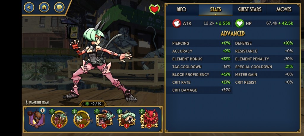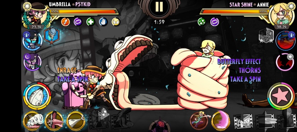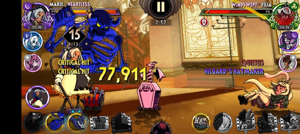 It condenses fighting controls into a series of taps, swipes, and buttons for specials. The mere fact that I can enjoy a fighting game with these controls is worth celebrating, but I mostly want to zoom in on the other genres Skullgirls borrows from. Moves are equipped pre-combat, and come loaded with different stat boosts. Much of the game ends up being pouring over these equips and optimizing for the challenges presented, very reminiscent of a good RPG. These comparisons continue well into the combat itself.