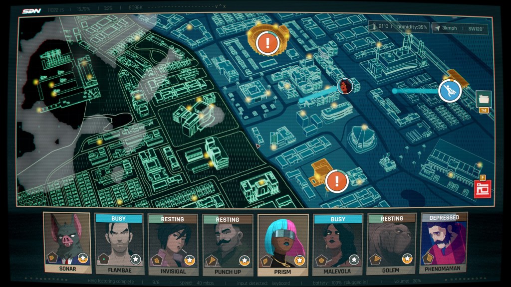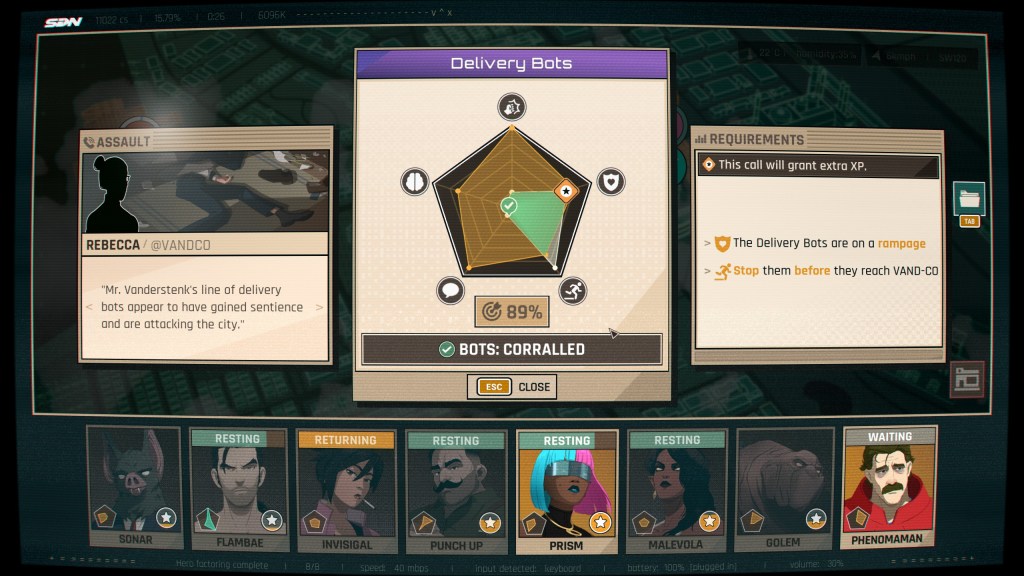 Dispatch is a superhero workplace drama comedy, where you play as a superhero, Robert, who has been laid low by villains. You are hired for a desk job dispatching superheroes in exchange for the company taking steps to restore your superhero status. I’m being purposefully opaque with the game’s plot because the narrative is the beating heart of this game. More than any other game I have played, one could get most of the experience of this game by watching a stream of someone else playing it. There are solid mechanics at play here, but many of them don’t meaningfully impact the story; They run parallel to it, imparting a sense of urgency where, behind the scenes, the narrative doesn’t seem to care if you fail to grasp the mechanics or not.
